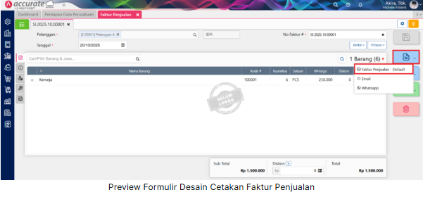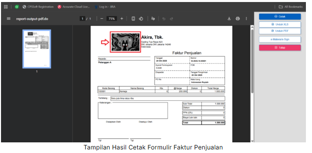 6. Untuk melihat hasil cetak Faktur Penjualan dengan Logo/Gambar bisa dilakukan dari menu Penjualan | Faktur Penjualan. Kemudian pilih faktur penjualan tertentu, klik 2x, lalu pilih Cetak dan pilih desain faktur yang dimaksud.