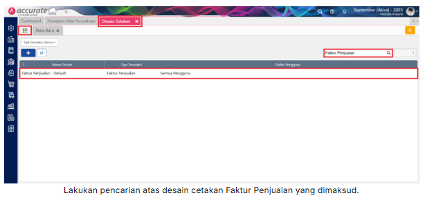 1. Ke menu Pengaturan | Desain Cetakan, lalu klik tombol Daftar berwarna hijau di samping tab Data Baru, dan lakukan pencarian atas desain cetakan Faktur Penjualan yang dimaksud.