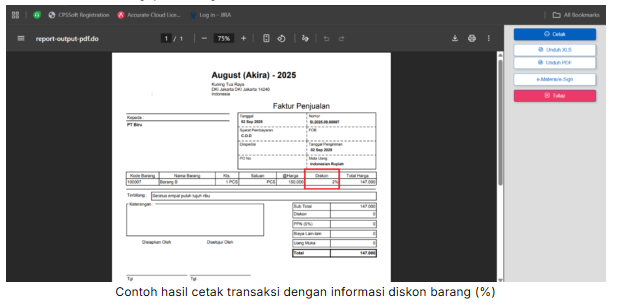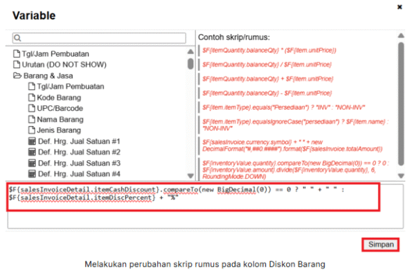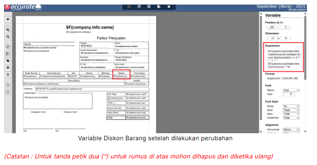 Berikut panduan untuk menampilkan tanda % (Persentase) di preview desain cetakan, misalkan di desain cetakan Faktur Penjualan ingin menambahkan tanda % (Persentase) di kolom diskon barang: