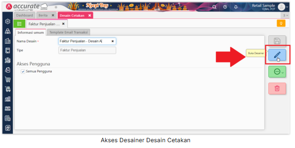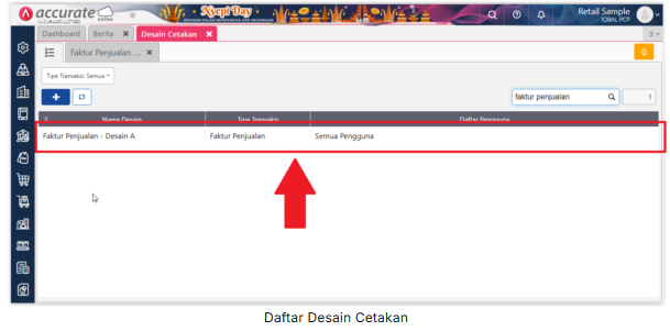 1. Buka desain cetakan Faktur Penjualan yang akan ditambahkan variable tanggal jatuh temponya, melalui menu Pengaturan | Desain Cetakan lalu ke Daftar Desain Cetakan.