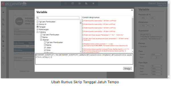 2. Pada variable “Jatuh Tempo”, ubah rumus skripnya seperti berikut ini : $P{REPORT_SCRIPTLET}.fmt($P{REPORT_SCRIPTLET}.addDate($F{salesInvoice.shipDate},$F{salesInvoice.paymentTerm.netDays}))