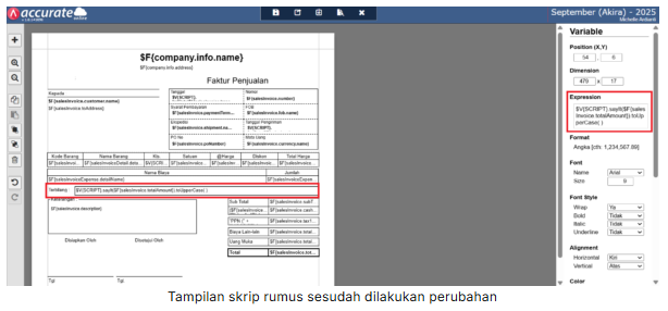 3. Klik kolom yang menampilkan informasi terbilang (Say), dan tambahkan skrip rumus .toUpperCase( ). Sehingga skrip rumus yang tampil pada kolom terbilang (Say) adalah $V{SCRIPT}.sayIt($F{salesInvoice.totalAmount}).toUpperCase( )