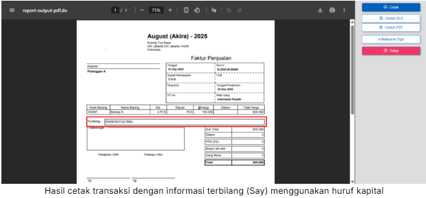 Misalkan, ingin menampilkan terbilang (say) dalam huruf kapital contohnya di Faktur Penjualan total sebesar Rp 600.000,- sehingga terbilang (say) nya menjadi ENAM RATUS RIBU. Berikut langkah – langkah untuk menampilkan informasi Terbilang (say) dengan Huruf Kapital di desain cetakan Accurate Online: