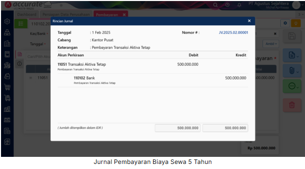 4. Kemudian ke tab “Rp” lalu pilih akun silang “Transaksi Aktiva Tetap” dan isikan nilainya sejumlah sewa yang dibayarkan untuk 5 tahun yaitu sebesar Rp 500.000.000.