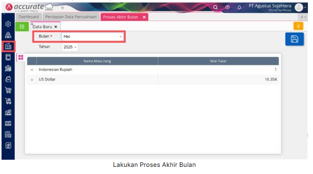 6. Dan setiap bulannya lakukan Proses Akhir Bulan untuk melakukan perhitungan nilai amortisasi atas Aset Tetap Tidak berwujud tersebut yaitu melalui menu Perusahaan.