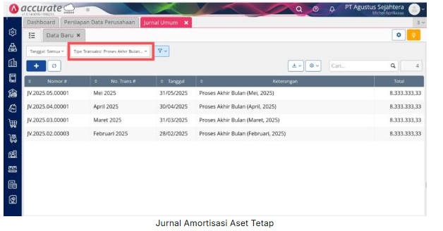7. Jurnal atas Proses Akhir Bulan dapa dilihat dari menu Buku Besar | Jurnal Umum, lalu klik tombol daftar di samping tab Data Baru dan pilih Tipe Transaksinya adalah Proses Akhir Bulan (Penyusutan).