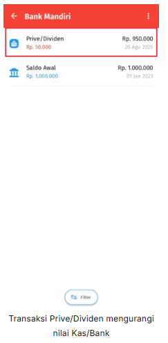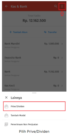 2. Pada halaman Kas & Bank, klik tombol titik tiga di bagian pojok kanan atas, lalu pilih Prive/Dividen untuk mencatat transaksi pengambilan uang.