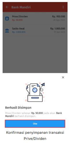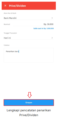 3. Lengkapi informasi yang sesuai pada formulir Prive/Dividen, kemudian klik Simpan untuk menyimpan transaksi penarikan saldo.