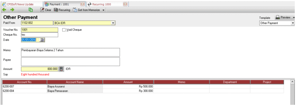 1. Anda pastikan sudah membuat recurring atas transaksi yang dimaksud. Sebagai ilustrasi kami membuatkan transaksi Other Payment dari Kas Bank.
