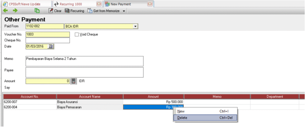 4. Setelah itu edit transaksi pada other paymentnya menjadi seperti gambar di bawah ini.