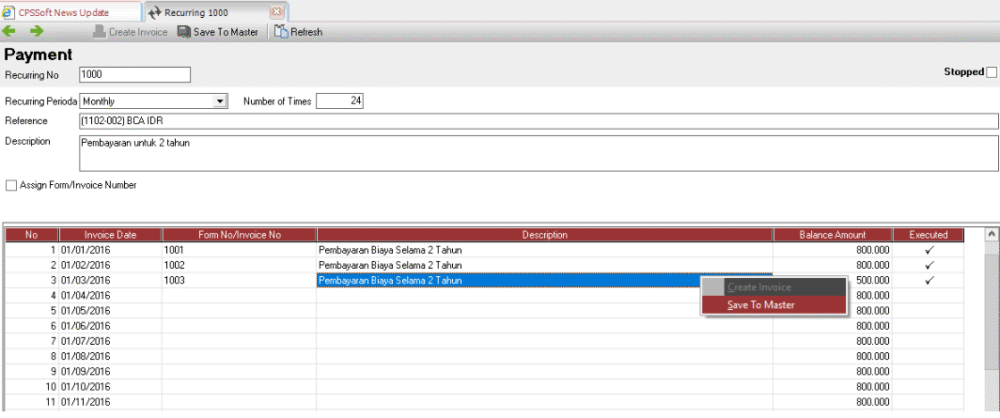 3. Misalkan setelah 2 bulan, biaya pemasaran akan ditiadakan dan hanya ada biaya asuransi, maka yang perlu dilakukan adalah buka terlebih dahulu transaksi bulan ke-3 dengan cara klik kanan Create Invoice.