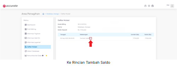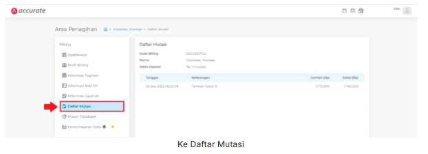 2. Pada dashboard area penagihan, pilih Nama Database yang ingin di-unduh Faktur Penjualannya, lalu klik pada informasi Daftar Mutasi.