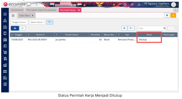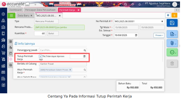 4. Dengan menutup transaksi Perintah Kerja, jika rentang waktu perintah kerja tidak diaktifkan atau jika sudah melewati masa rentang waktu-nya, maka transaksi Perintah Kerja tersebut tidak bisa diproses untuk Pengambilan Bahan Baku, Tahapan Proses dan Penyelesaian Barang Jadi. Dan status dari Perintah Kerja akan berubah menjadi Ditutup.