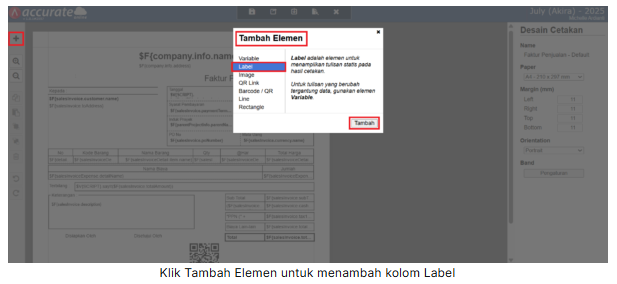 3. Klik tombol Tambah Elemen (icon +) | Label, klik tombol Tambah, lalu posisikan kolom Label tersebut pada bagian Rincian Barang, dan lakukan perubahan nama kolom tersebut, misal No.