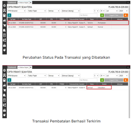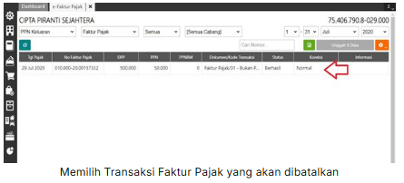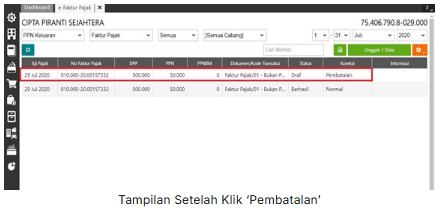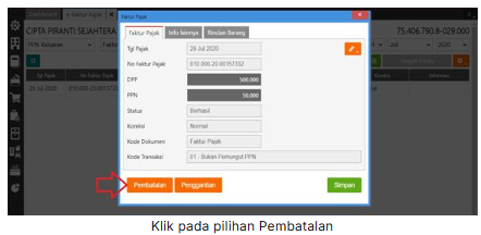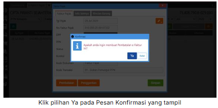 3. Kemudian pilih transaksi faktur pajak yang akan dibatalkan, lalu klik “Pembatalan” dan pilih ‘Ya’ pada konfirmasi pembatalan yang tampil