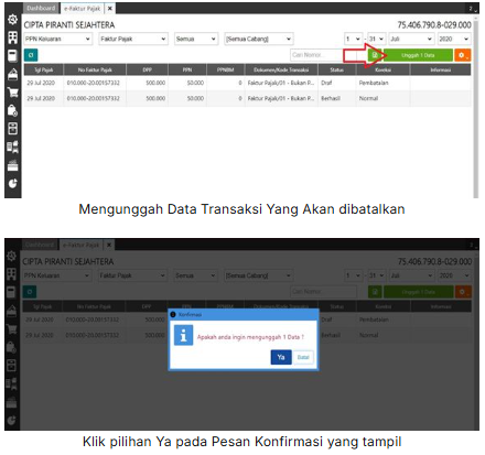 5. Kemudian klik unggah data untuk melaporakan faktur pajak pembatalan dan klik ‘Ya’ pada konfirmasi pembatalan yang tampil.