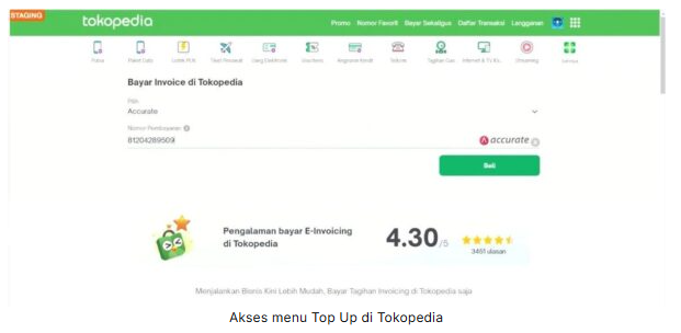 - Akses ke Tokopedia Anda, lalu ke menu Top Up | E-Invoicing | Accurate kemudian masukkan nomor pembayaran dengan nomor fakur proforma.