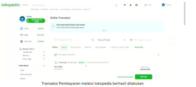 Jika pembayaran telah berhasil, maka status pada Tokopedia akan tampil seperti berikut ini :