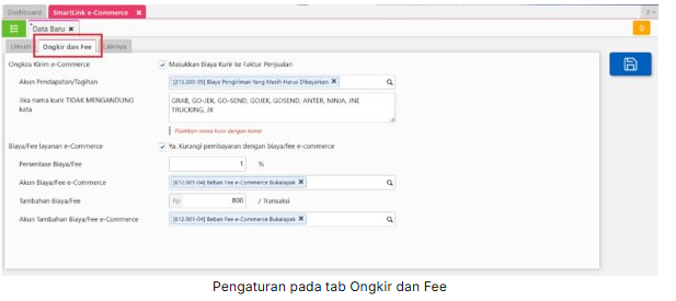 - Biaya/Fee layanan e-Commerce : Terdapat 2 pilihan biaya/fee layaan e-Commerce, yaitu berdasarkan Persentase Biaya/Fee dan Tambahan Biaya/Fee per transaksi. Anda bisa mengisikan kedua pilihan tersebut atau salah satu diantaranya dan nantinya nilai pada Penerimaan Penjualan akan otomatis dikurangi dengan biaya/fee layanan e-commerce tersebut.
