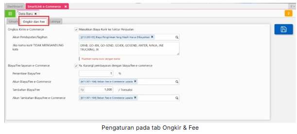 - Biaya/Fee layanan e-Commerce : Terdapat 2 pilihan biaya/fee layaan e-Commerce, yaitu berdasarkan Persentase Biaya/Fee dan Tambahan Biaya/Fee per transaksi. Anda bisa mengisikan kedua pilihan tersebut atau salah satu diantaranya dan nantinya nilai pada Penerimaan Penjualan akan otomatis dikurangi dengan biaya/fee layanan e-commerce tersebut.