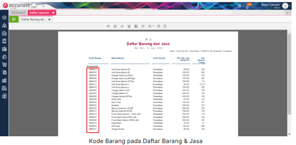 Ilustrasi : terdapat barang dengan kode barang 990013, 990015, 990004, 990005, dll seperti gambar berikut ini. Dan ingin menampilkan sebagian 4 karakter didepan dari Kode Barang, yaitu ‘9900’ saja pada Laporan Daftar Barang & Jasa.