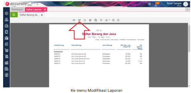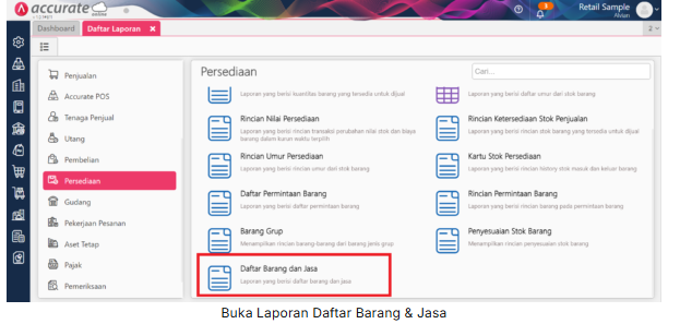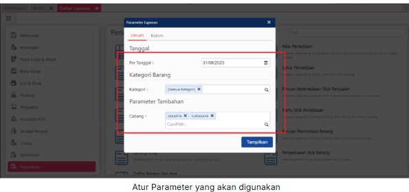 3. Ke Laporan Persediaan lalu buka Laporan Daftar Barang & Jasa tentukan Parameter laporan sesuai kebutuhan, lalu klik ‘Tampilkan’.