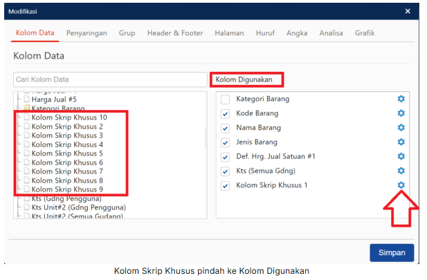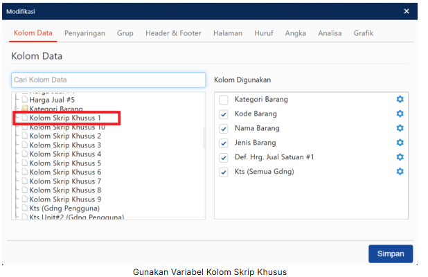 5. Pada tab Kolom Data cari dan klik 2x variable Kolom Skrip Khusus 1 (sesuai yang tersedia) sehingga tampil pada Kolom Digunakan lalu klik tombol Pengaturannya.
