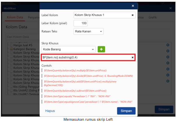 6. Jika yang dibutuhkan adalah menampilkan 4 karakter di depan yaitu “9900” maka bisa gunakan rumus skrip berikut : $F{item.no}.substring(0,4) lalu simpan.