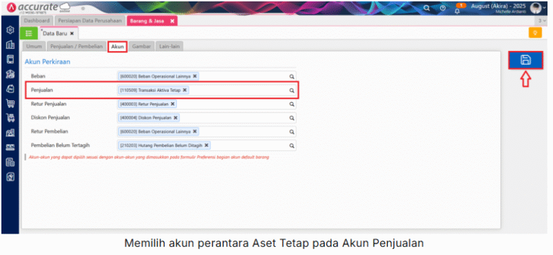3. Selanjutnya agar transaksi penjualan aset tetap ini bisa dikenakan PPN dan diakui sebagai piutang (tidak tunai), maka perlu untuk membuat barang baru dengan jenis barang adalah Non Persediaan. Namun sebelumnya perlu untuk memasukan akun perantara Transaksi Aset Tetap pada Akun Perkiraan Penjualan melalui menu Pengaturan | Preferensi | Akun Perkiraan | Barang & Jasa | Penjualan