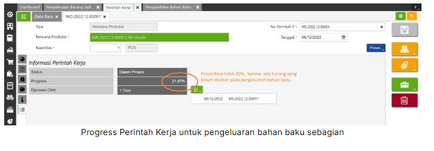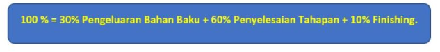 Maka prosentase progress tersebut didapat berdasarkan perhitungan Jumlah Kuantitas Bahan Baku yang dikeluarkan / jumlah total kuantitas bahan baku dikalikan dengan 30% = (26/36)*30% maka akan didapat nilai sebesar 21,67%.