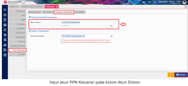 2. Kemudian, ke menu Pengaturan | Preferensi | Akun Perkiraan | Penjualan/Pembelian | Penerimaan/Pembayaran | Akun Diskon, pilih akun PPN Keluaran | Simpan.