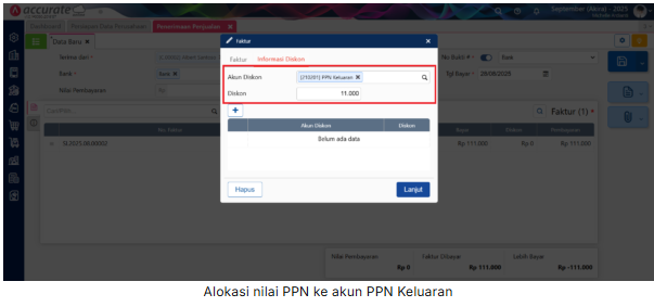 4. Ketika melakukan proses Penerimaan Penjualan, alokasikan nilai PPN yang dikenakan pada transaksi Faktur Penjualan yang sudah dibuatkan sebelumnya, ke akun PPN Keluaran pada tab Informasi Diskon.