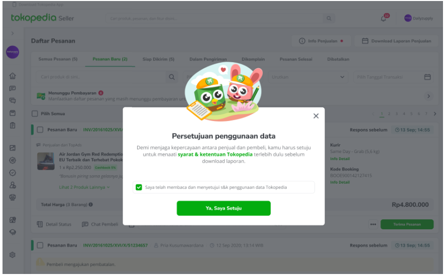 2. Sebelum download laporan, pastikan kamu sudah membaca ketentuan penggunaan data di Tokopedia. Centang persetujuan penggunaan data lalu klik ‘Ya, Saya Setuju’. Pada bagian ini, pastikan kamu tidak menyalahgunakan data pembelimu ya Seller.