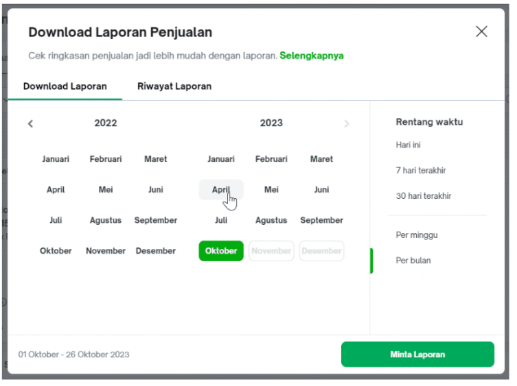 3. Atur rentang Waktu Download Laporan Penjualan, lalu klik ‘Minta Laporan’. Kamu bisa download laporan berkali-kali hingga 10 tahun terakhir dengan cara ubah Rentang Waktu menjadi per bulan, kemudian pilih bulan dan tahun yang ingin kamu download.