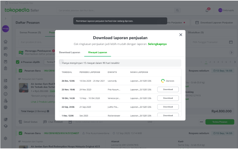 Gimana, mudah kan? Kamu juga bisa melihat riwayat laporan yang sudah berhasil kamu download. Laporan penjualan akan menyimpan data selama 3 bulan terakhir dari tanggal request laporan dengan maksimal 15 laporan per akun. Jika laporan terhapus, kamu juga bisa mendownload ulang.