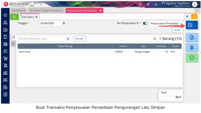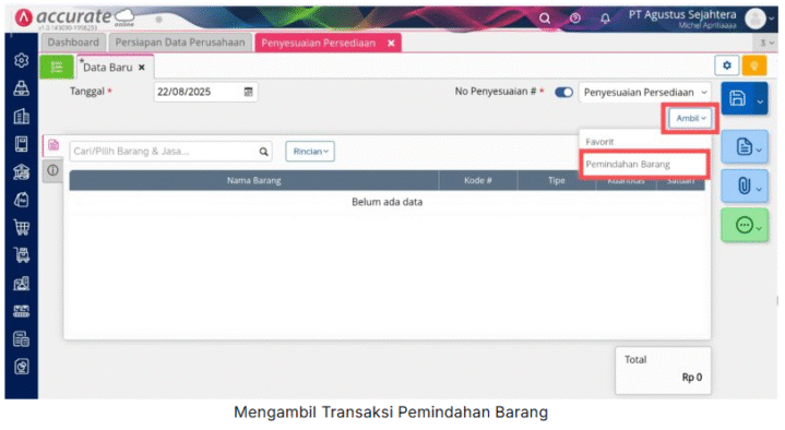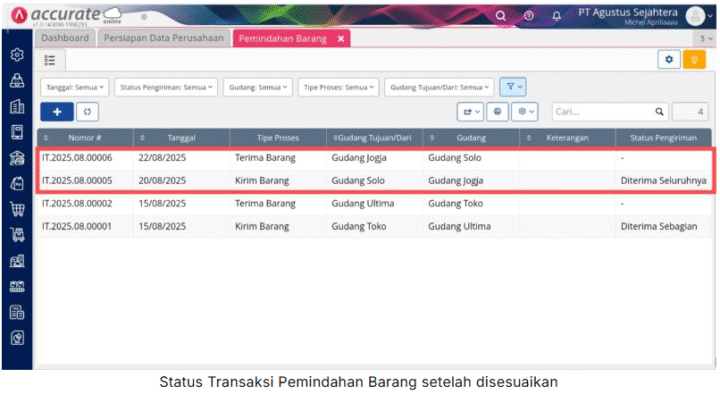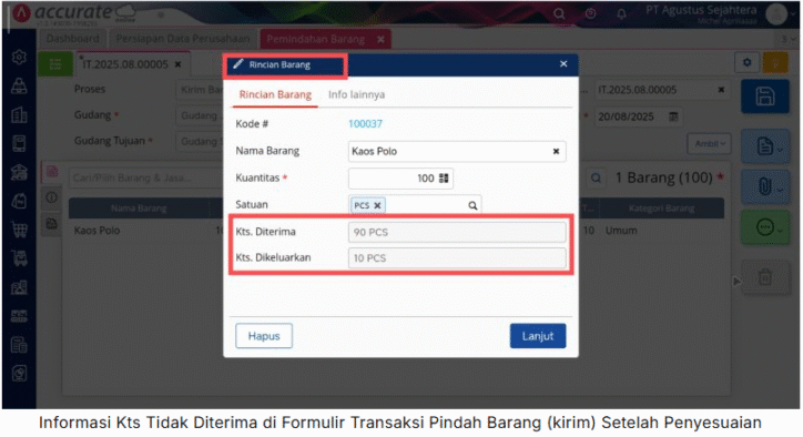Catatan : Pengurangan Stok atas barang yang rusak/hilang melalui Penyesuaian Persediaan dilakukan setelah proses Transaksi Pemindahan Barang selesai dilakukan yaitu sudah membuat Transaksi Pemindahan Barang (Terima) atas semua barang yang tidak rusak/hilang di Accurate.