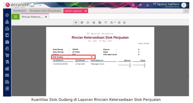 Sedangkan berikut ini tampilan stok gudang di Laporan Rincian Ketersediaan Stok Penjualan.