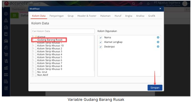 3. Pada modifikasi bagian Kolom Data, klik 2 kali pada variabel Gudang Barang Rusak hingga berpindah ke Kolom Digunakan. Kemudian klik Simpan.