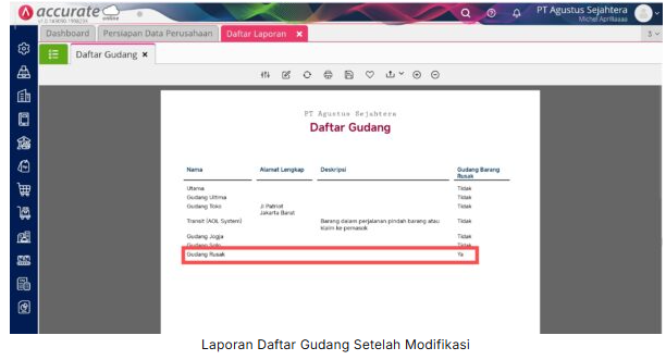 4. Maka pada Laporan Daftar Gudang akan menampilkan kolom baru berisi informasi apakah gudang tersebut termasuk Gudang Barang Rusak atau tidak.