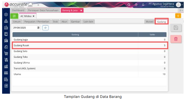 5. Kemudian Anda bisa cek apakah benar selisih 5 kuantitas tersebut berada di gudang rusak yang telah diketahui dari laporan di atas melalui menu Persediaan | Barang & Jasa, kemudian buka barang yang dimaksud. Lalu pada tampilan detail barang, klik tab Gudang. Maka akan tampil rincian masing-masing kuantitas barang di setiap gudang.