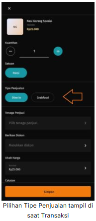 Setelah melakukan Pengaturan Tipe Penjualan di database Accurate Online, maka akan tampil pilihan Tipe Penjualan pada aplikasi Accurate POS setelah Anda memilih nama produknya, sebagai berikut ini :