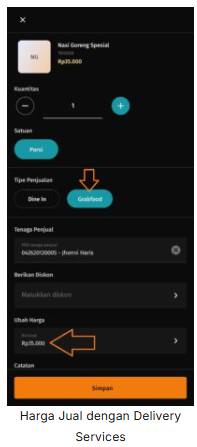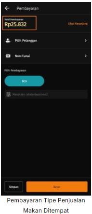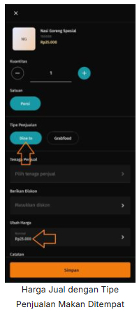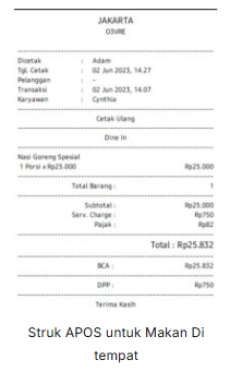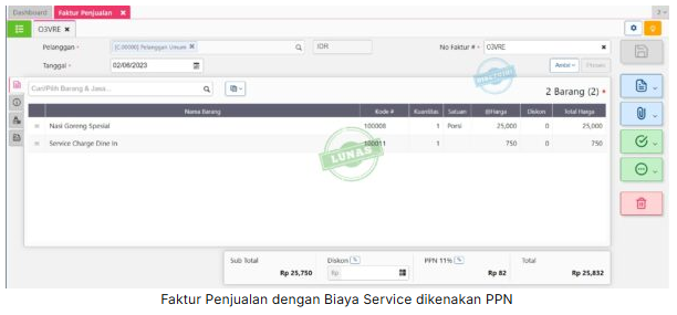 1. Dine In (Pembayaran Ditempat), dengan Service Charge pilihan Persentase sebesar 3% dan dikenakan PPN (11%), maka didapatkan nilai pembayaran sebesar Rp 25.832 dengan harga jual produk sebesar Rp 25.000.