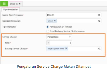 Dan nilai Biaya Layanan (Service Charge) akan otomatis diperhitungkan saat akan dilakukan pembayaran. Sehingga Nilai Pembayaran yang tampil sudah diperhitungkan dengan nilai Service Charge-nya. Sebagai ilustrasi dengan pengaturan Biaya Service berikut ini :