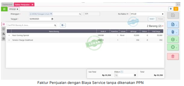 Transaksi penjualan setelah tersinkronisasi ke database Accurate Online akan terbentuk Faktur Penjualan serta Penerimaan Penjualannya. Dan tampilan Faktur Penjualan dengan Service Charge dikenakan PPN atau Tanpa PPN, di Accurate Online akan sebagai berikut :