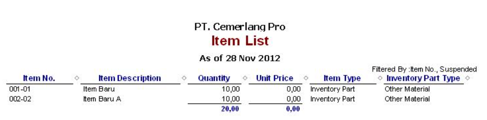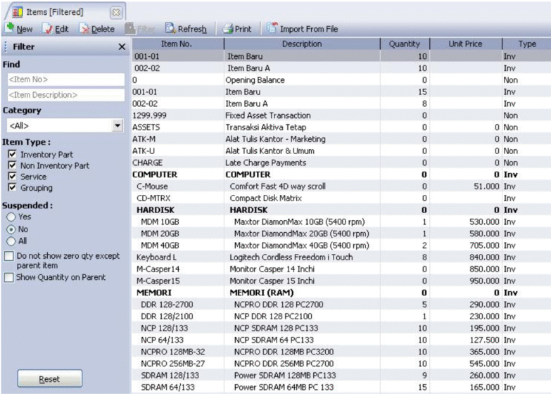 - Pastikan semua item ditampilkan dengan cara, Filter Category = “All”, Semua filter Item Type sudah tercentang semua, Filter Suspended = “All”, Checkbox “Do not show zero qty except parent item” sudah di uncheck.