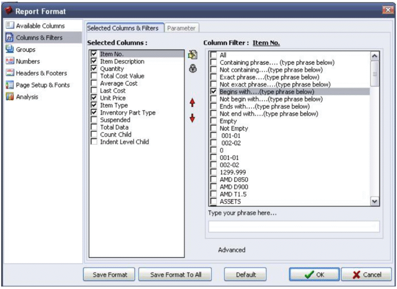 - Pada “Selected Columns & Filters” kita filter Item No hanya yang “Begins with….” lalu isikan “Type your phrase here” dengan spasi.